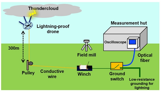 To actively trigger lightning, NTT devised a method in which a conductive wire connects the drone to the ground, with a high-voltage switch installed on the ground side.