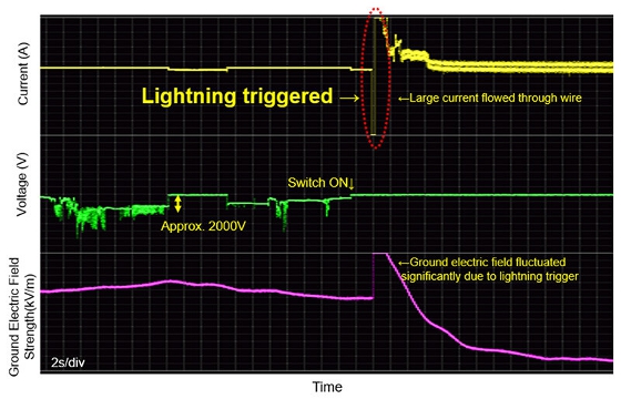 Just before the lightning strike, it was confirmed that a voltage of over 2,000 V had developed between the wire and the ground. This rapid increase in local electric field strength triggered a lightning strike directed at the drone. The company says this experiment marks the first successful case in the world of triggering lightning using a drone.