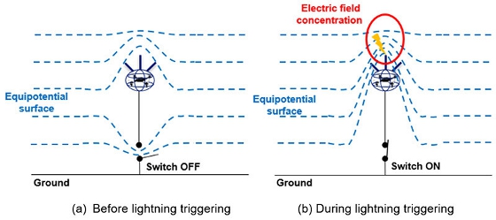 By operating this switch at the optimal moment, the researchers gain the ability to rapidly change the electric field around the drone. This sharp increase in local electric field strength encourages a lightning discharge to occur toward the drone (Figure 6).