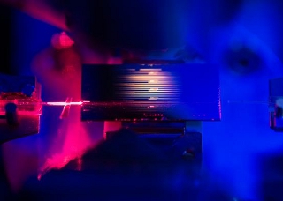 Close-up of an optical amplifier chip, similar to the one detailed in this study, that is being developed in the lab of Stanford physicist Amir Safavi-Naeini. A red laser light shines from an optical fiber on the left to help with aligning the fiber to the chip. [Credit: Jim Gensheimer for Stanford University]