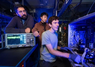 Stanford doctoral student Devin Dean (right) prepares to measure an optical amplifier chip in the lab of Amir Safavi-Naeini, (left) associate professor of applied physics. Dean, Safavi-Naeni, and Taewon Park (middle) are co-authors of the study describing a new low-power optical amplifier chip that can fit on devices as small as a smartphone. [Credit: Jim Gensheimer for Stanford University]