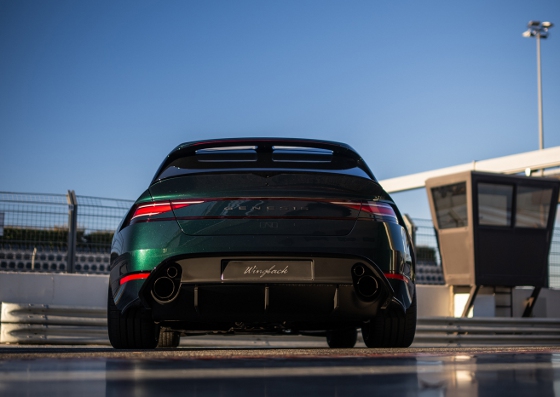 In profile, the G90 Wingback Concept carries the parabolic line and the long wheelbase of the G90, with the roofline stretched delicately to achieve a sleek grand tourer wagon silhouette. The rear end replaces the sedan's trunk with a tailgate housing a sharply raked rear window framed by two spoilers, further accentuated by the performance-inspired rear diffuser structure.