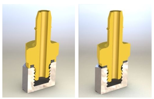 Tapered pipe threads, such as 1/16 - 27, 1/8 - 27 and 1/4 - 18 NPT, are also very common since they have been used for so many years. Tapered pipe threads are somewhat vibration resistant. They are in widespread use throughout the industry and in HVAC type plumbing, but tapered threads have disadvantages. Pipe threads leak unless a thread sealant is used. Additionally, due to the tapered thread design, pipe threads do not allow for an easy way to position the outlet of elbow and tee fitting configurations. The only way to position the outlet(s) is to vary how much the fitting is tightened or loosened -- and that can lead to over tightening or leakage.