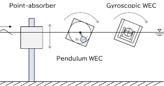 Comparison among different concept types of WEC: a point-absorber, pendulum-type WEC, and gyroscopic WEC. [Credit: Figure adapted from T. Iida, Journal of Fluid Mechanics, Cambridge University Press, 2026/Courtesy of The University of Osaka]